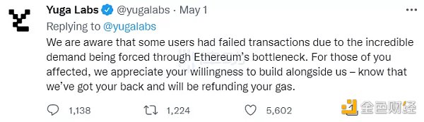 Yuga Labs 表示将退还用户因交易失败而花费的 Gas Fee