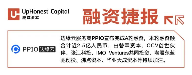 UpHonest Capital早期投资项目——边缘云服务商PPIO近日宣布完成A轮融资,本轮融资额合计近2.5亿元人民币,由磐霖资本、CCV创世伙伴、张江科投、IMO Ventures共同投资,老股东蓝驰创投、沸点资本、华业天成资本等持续加注。