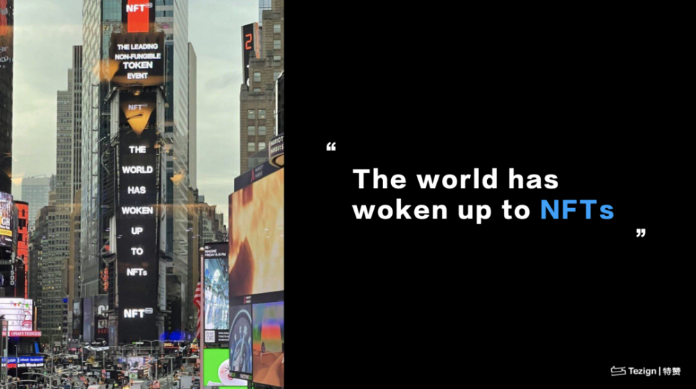 艺术维度,尽管目前数字藏品尚在早期阶段,项目多以(PFP)个人头像为主,但是它提供了一个新的机会和平台给到内容创作者、技术开发者们。当纽约时代广场上这句“世界将因NFTs而重燃热情”的点亮时候,同时它也点燃了Web 3“原生代”的热情。