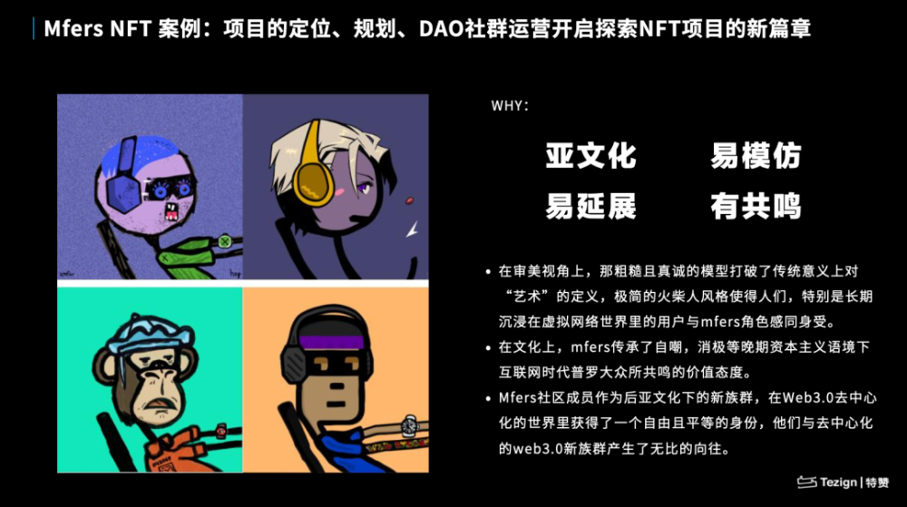 DAO社区:Mfers的模型构思和自发运营的社区,是对目前全球集体出现的“丧文化思潮”呼应。在“精英”NFT项目中脱颖而出,恰恰是由于Mfers传达的这种“反精英”文化,才显得弥足珍贵和可爱。Mfer (Mfers项目持有者)们自称Web3世界中的“无产阶级”,传递着丧文化里颓废且自嘲的精神。