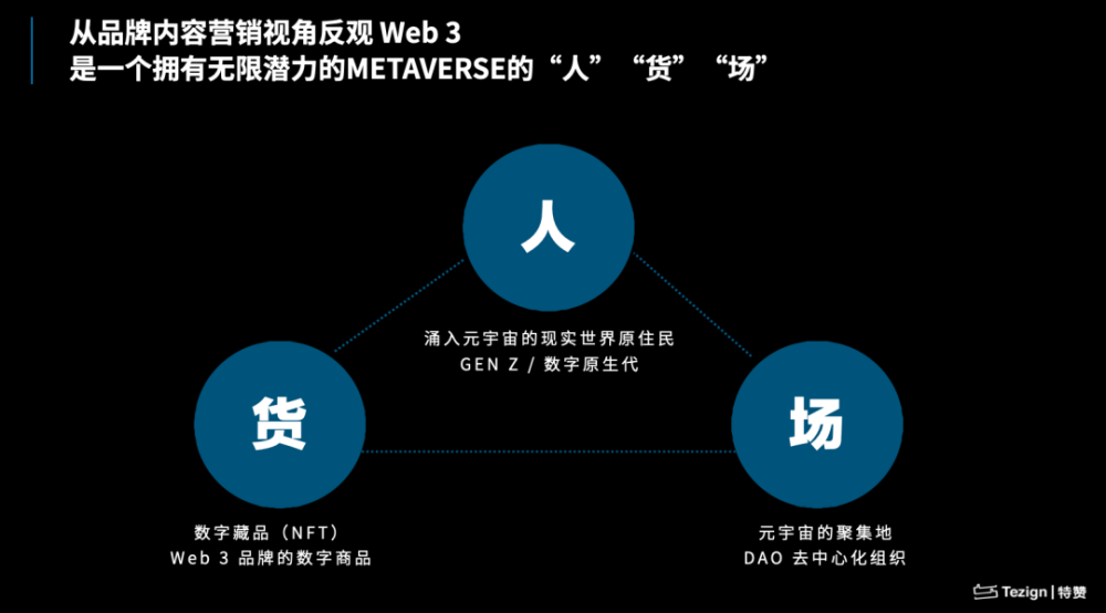 从营销视角来看,新技术Web 3 数字时代的品牌营销场域:人、货、场都在发生着变化,Web3品牌营销将会成为市场营销趋势,而数字藏品将会成为其中的主要数字内容切入点。