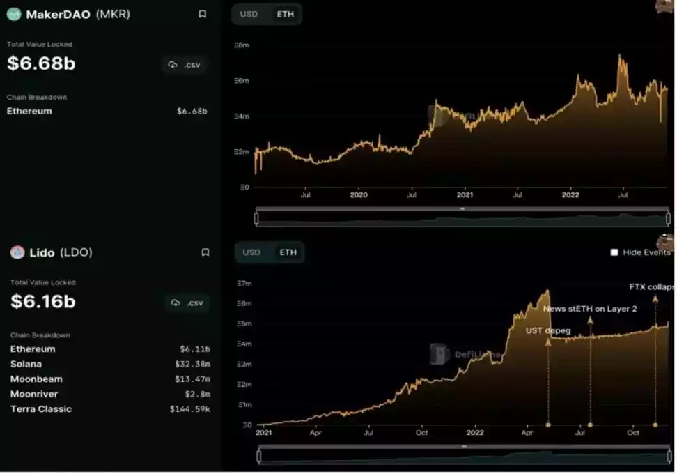 虽是股市熊市,可是 Defi 销售市场仍保持一定的魅力。从锁单量来说,假如加密市场以原生态财产 ETH 并非美金计费,那样 22 年 Maker DAO、Lido 等头顶部工程项目的 TVL 依然会完成正增长。即便以美元计算,Defi 行业市场依然维持 400 亿美金以上 TVL,比 21 年以前要好很多,这就意味着 Defi 销售市场已经成为加密市场必不可少一部分。