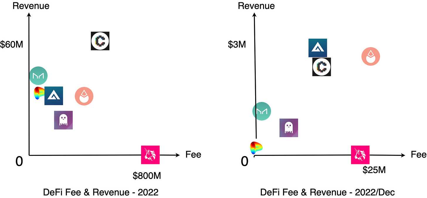 图中中,横坐标为花费,纵坐标为协议收入,花费可能还需要分给LP,收入才是和货币持有人有关的“真正收入”。总体来说, GMX/ Lido/ Convex 在熊市中依然拥有强劲收入,GMX/Lido 高考位次逆势上涨,此二者的币价还在年度主要表现不错。Curve/ AAVE/ MakerDAO 受股市熊市影响很大,而 Uni 则依旧是“毫无意义的治理代币”。