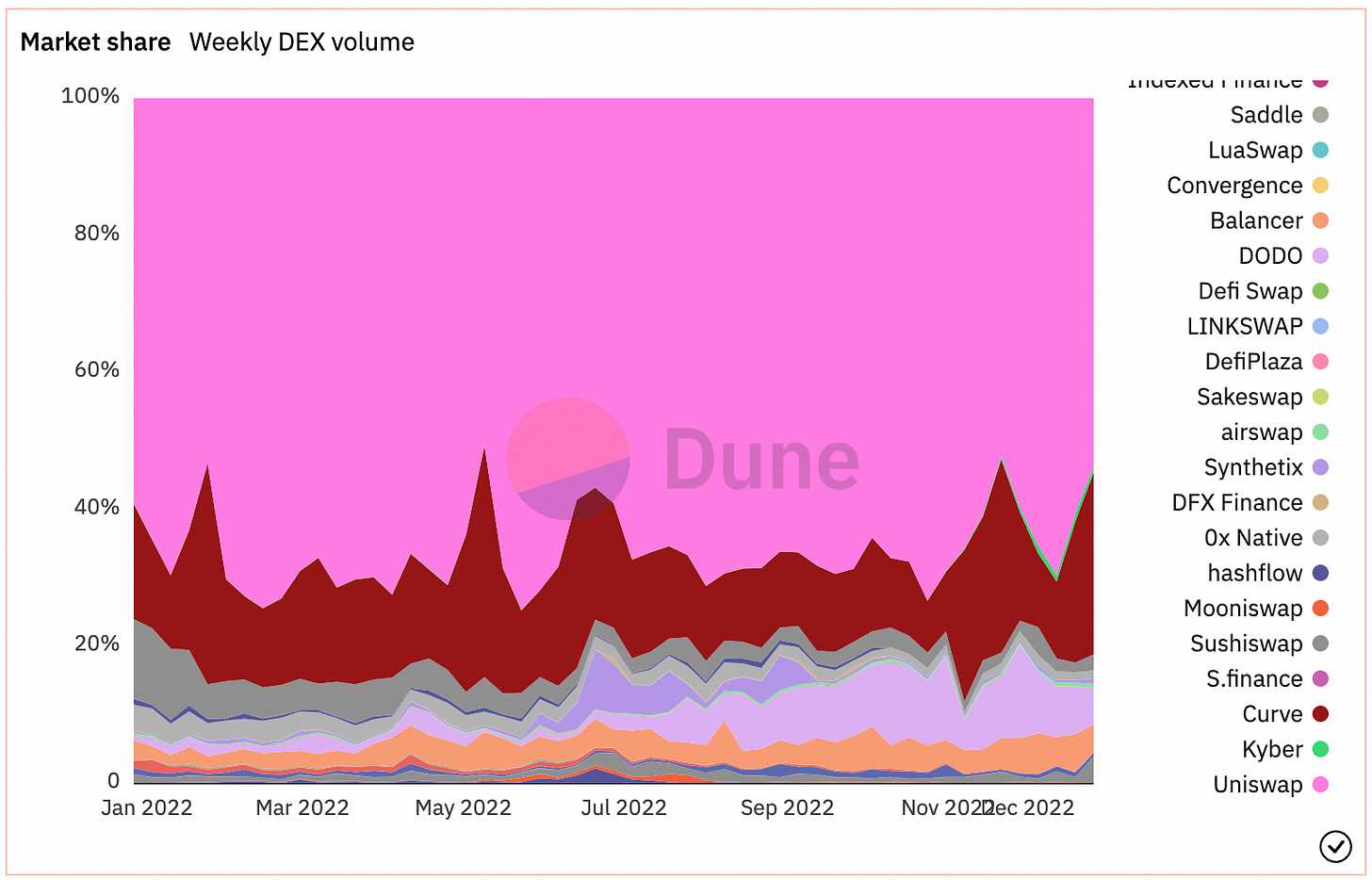 Uniswap: DEX。花费来源于 0.01% 至 1% 的交易费用。Uniswap 是头顶部协议中唯一收入为零的,Uniswap 小区在今年的曾一度试着根据整治网络投票打开花费电源开关,尽管网络投票根据但之后均没有下文,Uniswap 花费数据信息里的较大优势都不复往日。因为 Uniswap V3 高效率,其市场占有率长期保持,现阶段横着扩展至 NFT 买卖等行业。