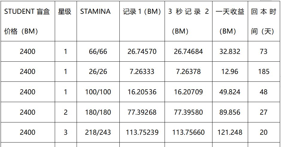 当前STAMINA越高,星级越高,REWARD收益越高,不同体力下的STUDENT回本周期。(因为升级后战场收益更高,以及pk获得收益也更高,还有就是每个玩家升级成功所花费石头数量不同,以下升级板块所花费石头成本不含在内)