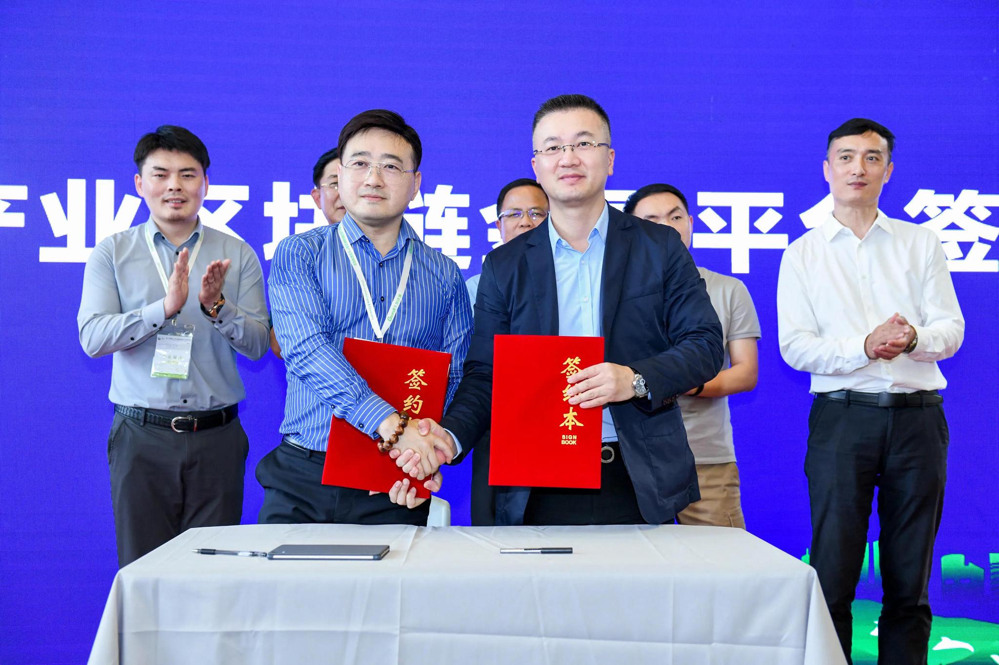 会上,浙经数字经济与绿龙生态两家企业签署了战略合作协议,浙经数字经济(杭州)科技发展有限公司董事长赵剑波与浙江绿龙生态科技有限公司董事长陈振华共同上台,进行花木产业区块链金融平台合作的签约,浙经国际董事局主席海波、浙江绿色大地投资建设集团有限公司总裁沈伟东、浙经数字经济CEO/联合创始人王淼、浙江绿龙生态副总裁翁灵巍、世界生产率科学院院士吴学新、蚂蚁智科事业群陈铭为签约仪式做了见证。