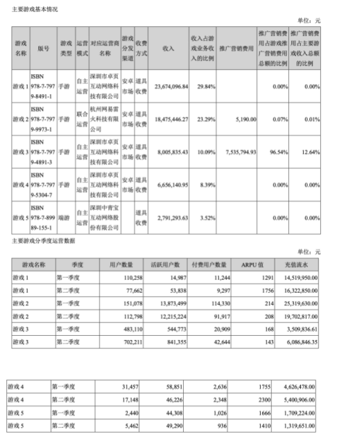数据显示,目前中青宝有5款游戏对游戏业务收入贡献较大,前两款游戏表现明显好于剩余3款,但其中充值流水最多的一款游戏,第二季度的数据相较于第一季度已有所下降,用户数量从15万下降至11万,充值流水也从2532万元下降至1970万元。