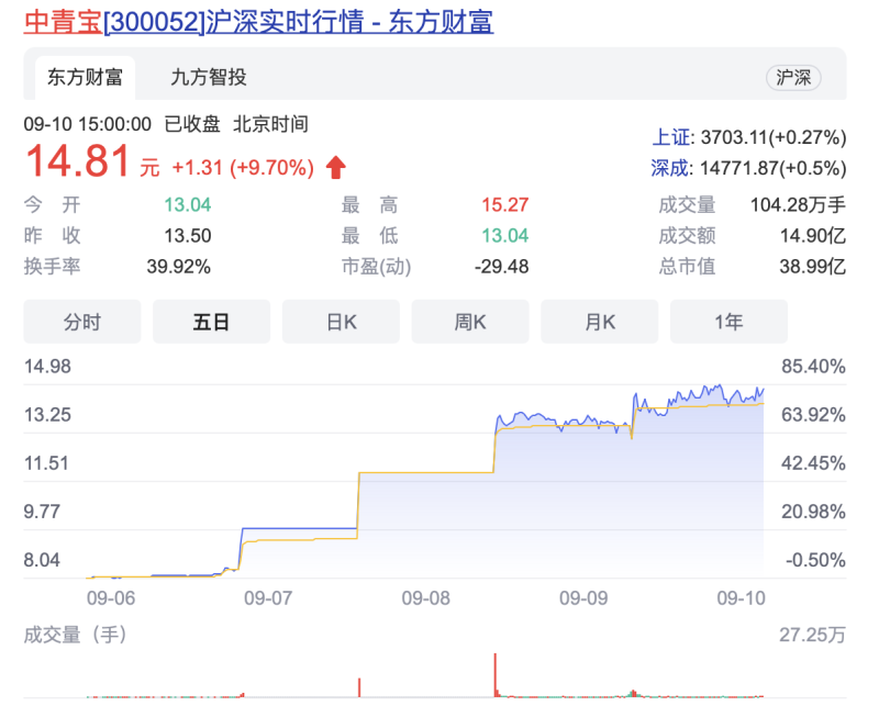 不过,这也引起了市场的关注,中青宝当日股价直接涨停。同花顺iFinD数据显示,9月7日至9月9日三个交易日,中青宝累计最高涨幅超70%。