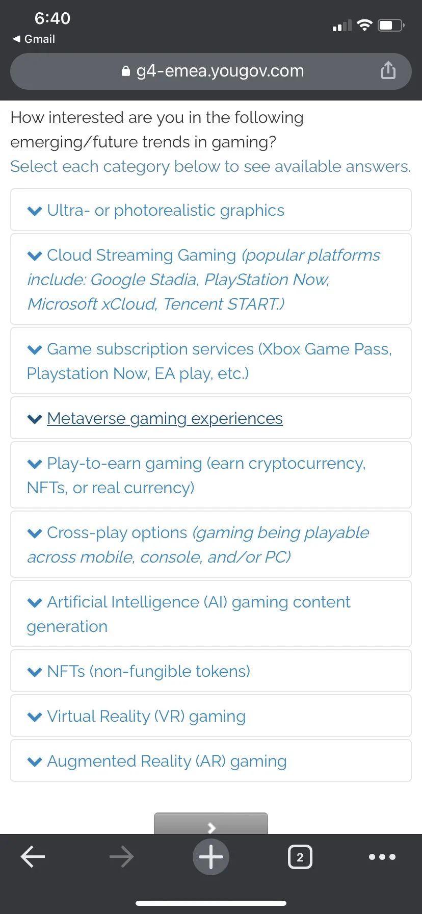 这份问卷中询问了玩家对一些新技术的看法,比如 NFT 以及通过“Play to earn”游戏赚取虚拟货币的感兴趣程度,另外问卷还涉及了多人游戏、VR 和订阅服务等内容。