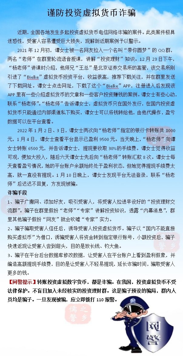 2021年12月初,谭女士被一名网友拉入一个名叫“带你圆梦”的QQ群,两名“老师”在群里轮流语音授课,讲解“投资理财”知识。12月23日下午,“杨老师”讲课时介绍,他师兄“王总”是北京证券交易所的高管,该交易所刚引进了“Bielke”虚拟货币投资平台,收益很高,推荐下载关注,并在群里发送了下载网址。谭女士点击网址,下载了这个“Bielke”APP,注册进入后发现该APP里有一些介绍虚拟货币的文章和一些客户投资赚钱的案例。谭女士有些心动,联系“杨老师”。“杨老师”告诉谭女士,虚拟货币只在国外发行,在国内投资虚拟货币只能通过内部渠道私下购买,谭女士可以将钱转给他,由他代操作,盈亏数据可以在平台查看。