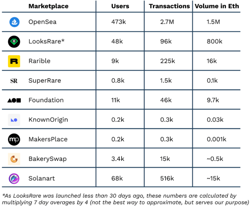 OpenSea已经是NFT市场中的领导者。但同时也面临新晋黑马LooksRare的强有力的威胁,这个新NFT平台在一些方面对于OpenSea有很多优势,比如费用低以及拥有原生的代币,也吸引了一些新用户。可以通过代币行为分享其所得手续费。从之前的表格看来,LooksRare 异军突起超越其他平台,并且交易量与OpenSea差距越来越小。