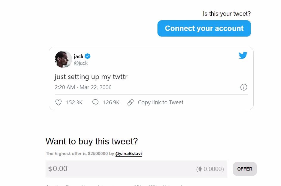 去年3月,推特的联合创始人、前CEO杰克·多西 (Jack Dorsey)在区块链市场宣布出售自己的第一条推特,内容为“我刚弄好了我的推特”。