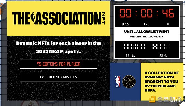 4月20日,NBA 宣布将于 4月21日在以太坊上推出名为The Association的动态 NFT 系列,白名单免费铸造,总量 18,000 枚。