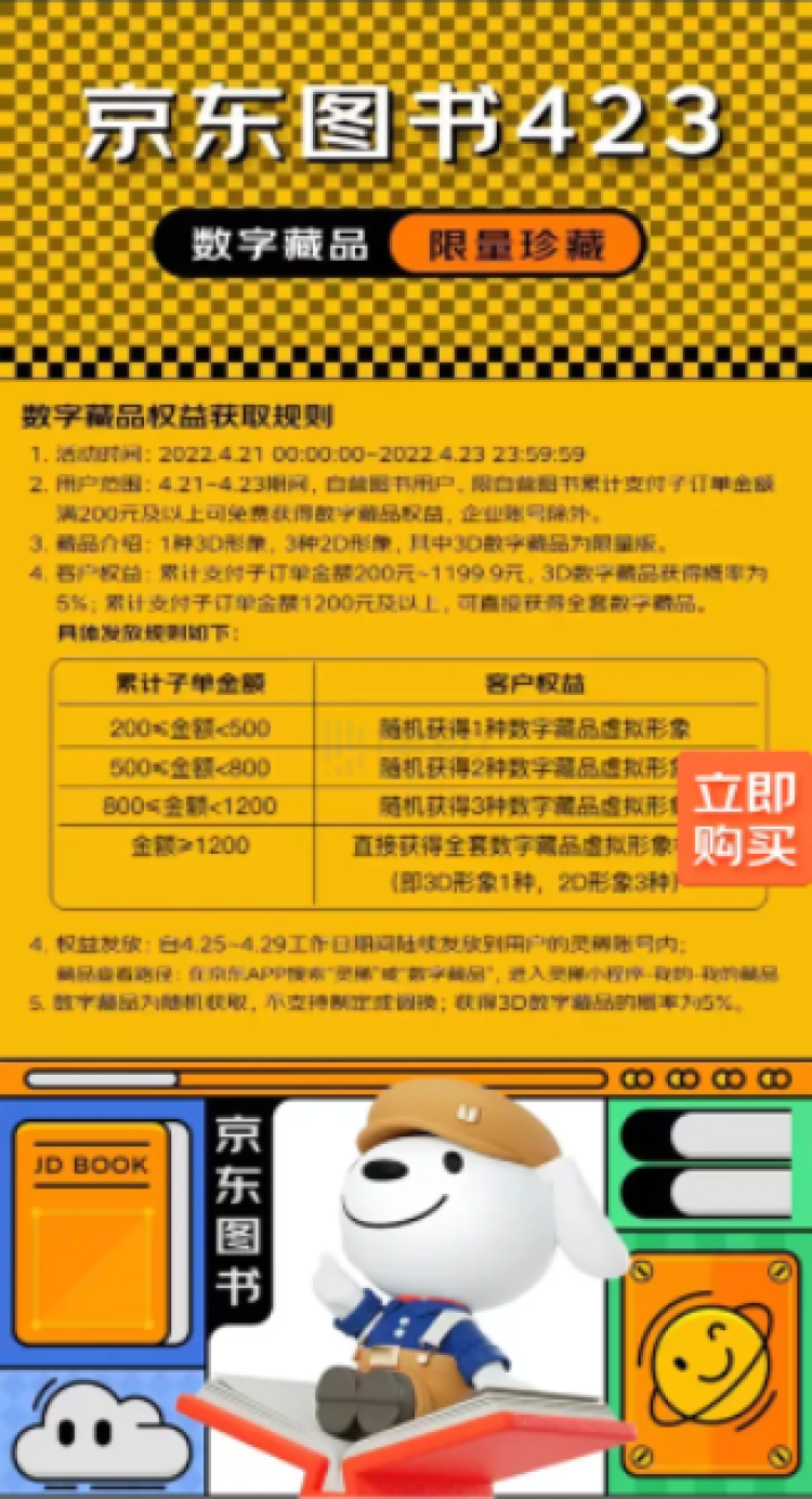 近日,京东图书举办“世界读书日”阅读嘉年华,活动于 4 月 21 日至 23 日举办,期间读者购买京东自营图书累计实付金额满 200 元即可获得京东 Joy 形象专属数字藏品。据了解,该藏品由京东云打造的数字藏品服务平台京东灵稀推出,全系列包含 3 款 2D 形象和一款 3D 形象。