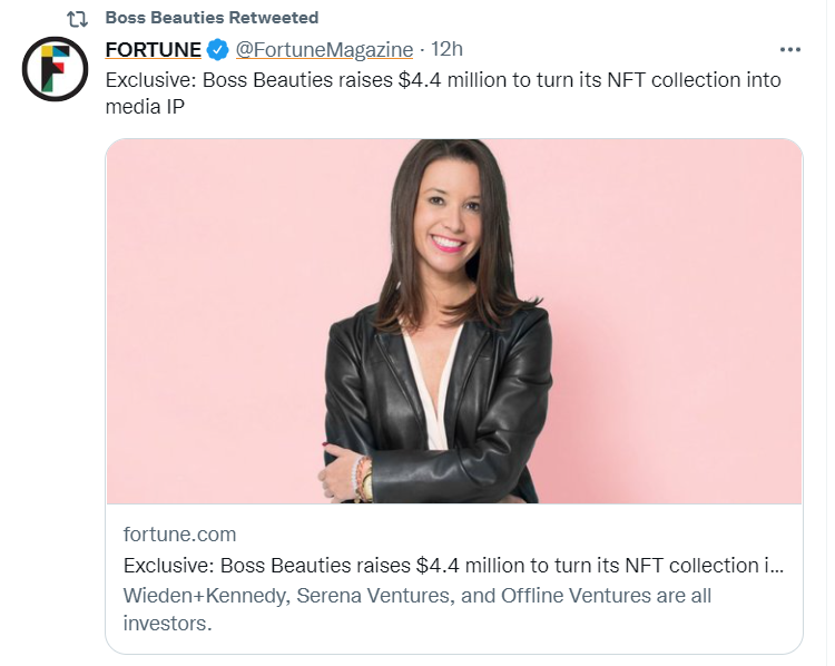 据《财富》杂志报道,专注于女性赋权的 NFT 系列 Boss Beauties 以 3000 万美元估值完成 440 万美元种子轮融资,Offline Ventures 领投,Serena Ventures 和 Female Founders Fund 等参投。
