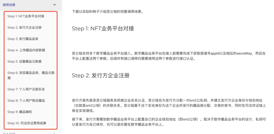蓝鲸财经注意到相关代码介绍页面解释了昆仑链的调用场景,包括:NFT业务平台对接、发行方企业注册、发行藏品品类等。即支持多个数字藏品业务平台接入并发行藏品确权等功能。