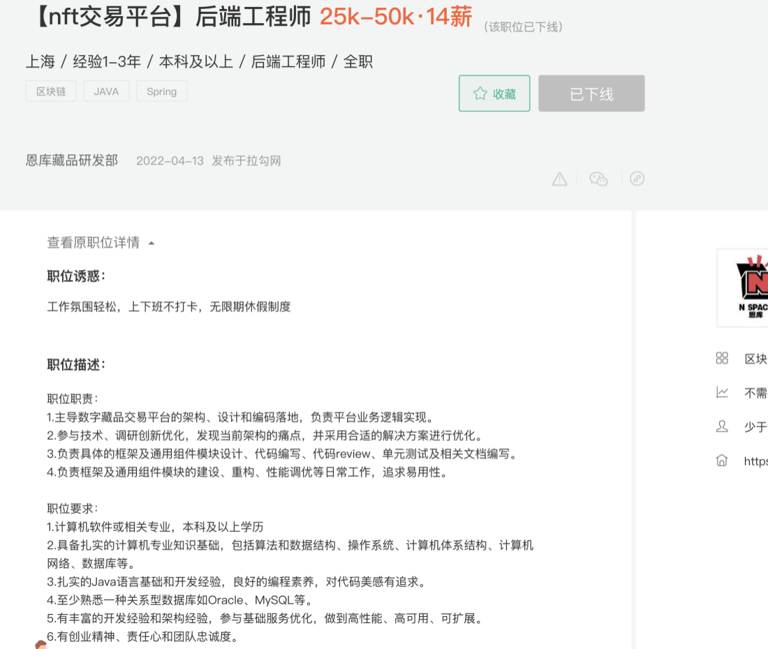蓝鲸财经查询发现,恩库藏品曾于4月12日在招聘网站发布“nft交易平台后端工程师”的招聘信息,主导数字藏品交易平台的架构、设计和编码落地,负责平台业务逻辑实现等,薪资待遇为每月2.5万至5万。目前该职位已下架。