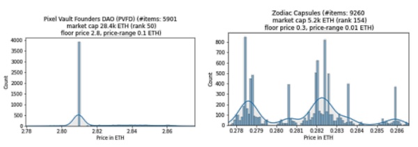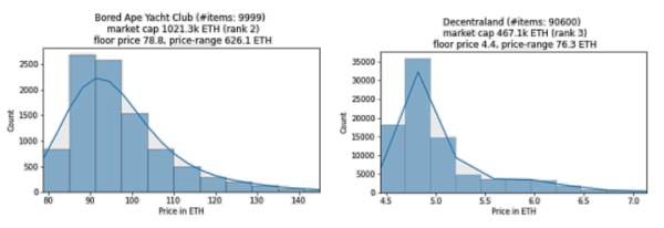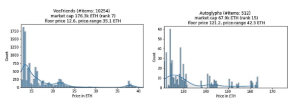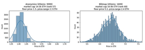 主要发现之一是,跨系列和类别的 NFT 商品,比同一系列内商品的行为表现得可能更相似。因此,价格分布分析可以让用户和开发人员更全面地了解在哪里最能找到流动性,以及金融化方法的可实现市场。