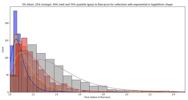 基于上述观察,同时由于地板价可以用作合理的锚点,我们参照具有指数式衰减和类对数正态这两种形态的 NFT 系列来对价位进行界定。当然,“绝对”的地板价可能只是标价最低的一件商品,所以我们希望找到适当的乘数,用以将更多商品归类为地板价商品。