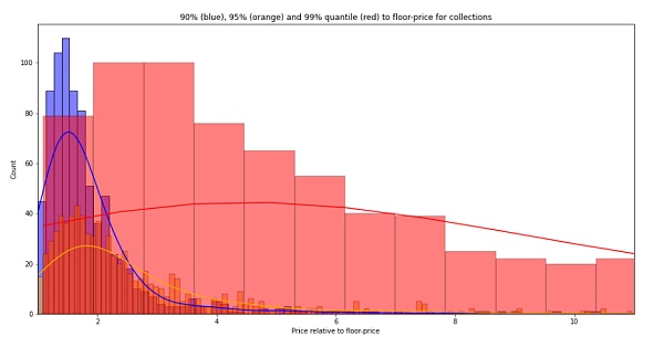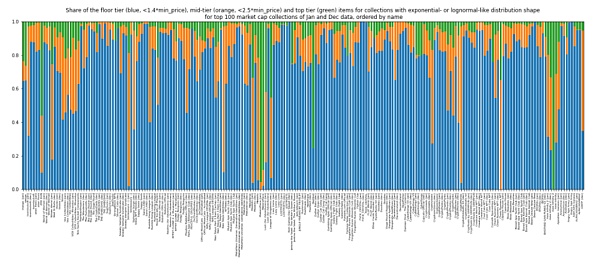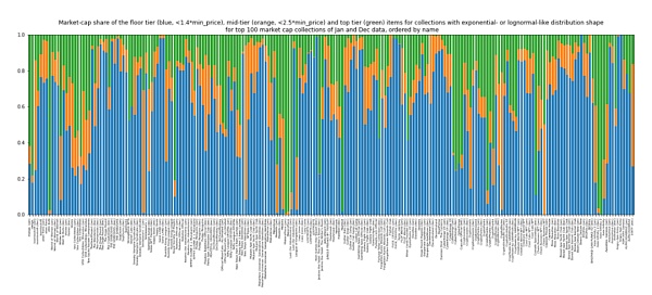 关于商品在三个价位中的份额,我们看到地板层商品(蓝色)份额最大。但有个别地方它们占比相当小 ,这与我们对形态的定义模糊有关。例如 Meebits(第一个条形图)没有完全遵循我们的价位逻辑,因为它存在我们前文详细展示过的额外凸起: