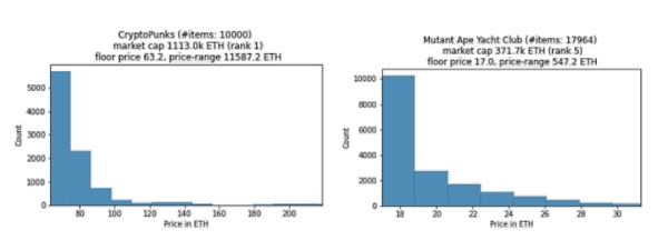 NFT 系列内,价格分布大都遵循同一模式,即大多数 NFT 的价格都接近地板价。少量剩下的那些构成了价格区间的主体,因此对该系列 NFT 的总市值贡献巨大。