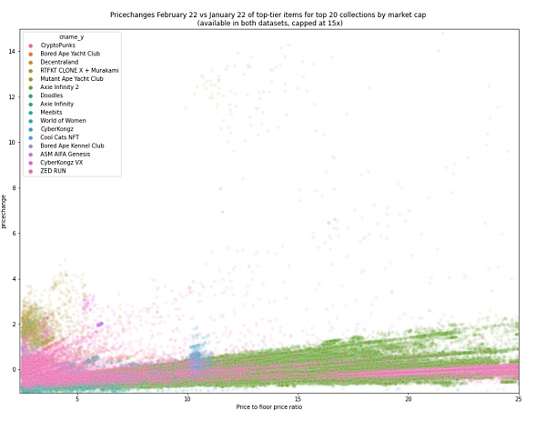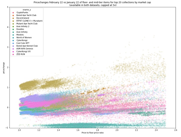 从 1 月和 2 月的数据中拉取的 537 个系列中,有 166 个的价格分布形态发生了变化(30%)。1 月至 12 月,我们也看到了类似的变化比例 (25%)。这听上去好像很多,但请记住,前文对 NFT 系列分布形态的分类是略显模糊的,因为我们的分类标准不是很严格。