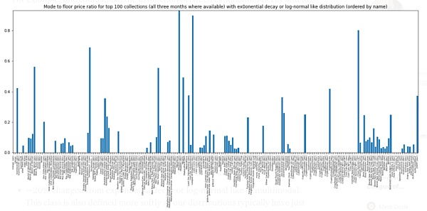 例如,可以按照 ” 如果众数 地板价 = 对数正态 ” 的逻辑来区分指数式衰减和对数正态。看看下面的众数地板价比,我们选择了更宽松的定义,甚至允许众数比地板价高出 10 - 20%,因为我们采用了拟合分布来对形态进行分类。