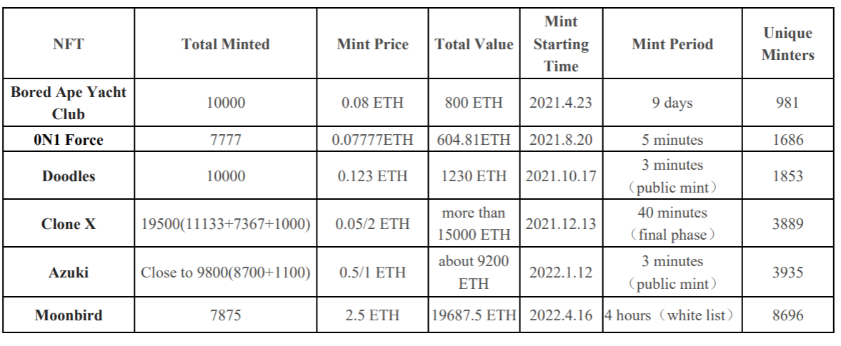 而从融资规模和效率上讲,INO也在不断的进步,从BAYC在2021年4月花费9天时间的800ETH募资额,到新晋蓝筹MoonBird于2022年4月在极高关注度情况下的短时间接近20000ETH的募资额,随着人们更加适应和接受这样的一种融资方式,PFP INO的规模和效率正在迅速提升。这种趋势的形成来自于项目方背书,募资环境等的综合提升。