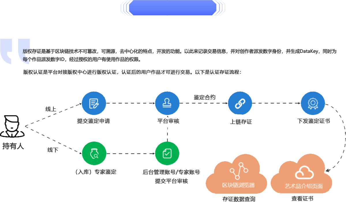 版权认证是平台对接版权中心进行版权认证,认证后的用户作品才可进行交易。以下是认证存证流程: