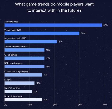 总体而言,更多的玩家对以积极的方式参与游戏内广告感到满意,但也有35%的玩家表示广告“没有效果”。在玩家们关于NFT的游戏的未来的态度上,39%的玩家表示应该会在元宇宙上实现,30%的玩家认为是VR游戏。然而,尽管目前有32%的玩家群参与跨平台游戏,但对其未来潜力的兴奋程度要低得多,只有15%的受访者热衷于与跨平台游戏玩法互动。值得注意的是,只有16%的受访者对基于NFT的游戏感兴趣, 与目前正在游戏玩NFT游戏的受访者数量(预占19%)相比略有下降。