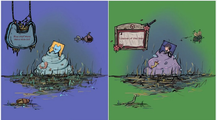 在加密熊市背景下,NFT 市场已经从‘我们都会成功’变成了‘我们都会死去’(we’re all gonna die)。在过去的几周时间,加密行业发生了翻天覆地的变化,NFT 市场情绪也变得低迷且“反乌托邦”,一些 NFT 创作者为了宣泄自己的感受,开始推出一些暗黑系 meme,甚至开始拿“厕所文化”来嘲讽当前熊市。