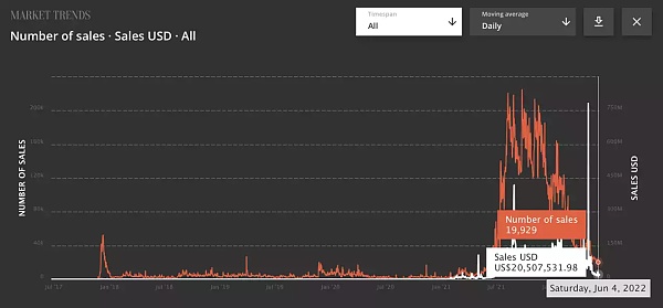据数据平台 Nonfungible 图表显示,从全球 NFT 的交易量上来看,全球 NFT 最火热的阶段处于 2021 年第三季度,最高单日的交易量出现在 2021 年 8 月 12 日,当日单日交易量为 137.14 万笔。此后,NFT 市场的交易热度迅速下滑。截至 2022 年 6 月 4 日,全球当日 NFT 市场的交易量仅约有 1.99 万笔,是最高单日交易量的约 1.5%,缩水超 90%。