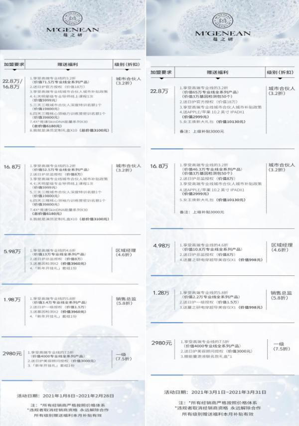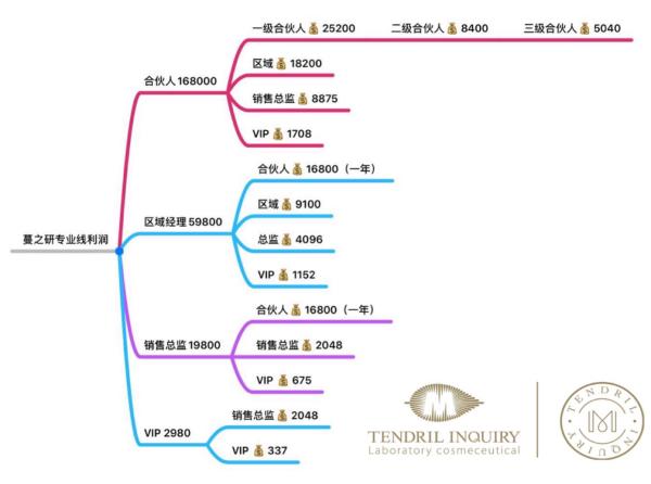其中,一名自称是城市合伙人的蔓之研代理告诉记者,蔓之研专业线的产品代理有5个级别,其中,“一级”(门槛2980元)、“销售总监”(门槛1.98万元)、“区域经理”(门槛5.98万元)、“城市合伙人”(门槛16.8万元/门槛22.8万元)4个级别代理所享受的折扣分别为7.5折、5.8折、4.6折、3.2折。