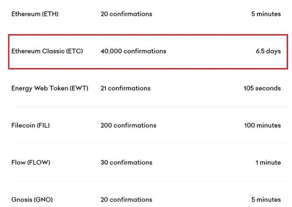 对于大多数交易所来说,一次确认就足以让他们记入用户的加密货币,除非用户将ETC发送到Kraken,在这种情况下,用户需要等待4万次确认,大约需要一周时间。