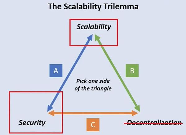 如果我们勾选第一个选项,我们就牺牲了可扩展性。如果我们选择第二个,我们就牺牲了去中心化,如果我们选择第三个,我们就牺牲了安全性。