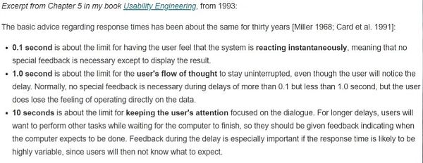 数十年的人因工程学研究表明,一个人在与计算机交互的0.1秒内得到的任何反馈都被认为是即时的。如果反馈出现在互动的1秒内,是非常明显的,但不会被解释为延迟。