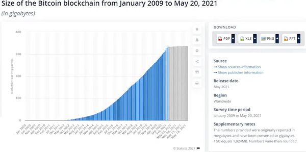 这意味着随着时间的推移,比特币区块链的规模会增长。今天,比特币区块链的大小大约是337GB。