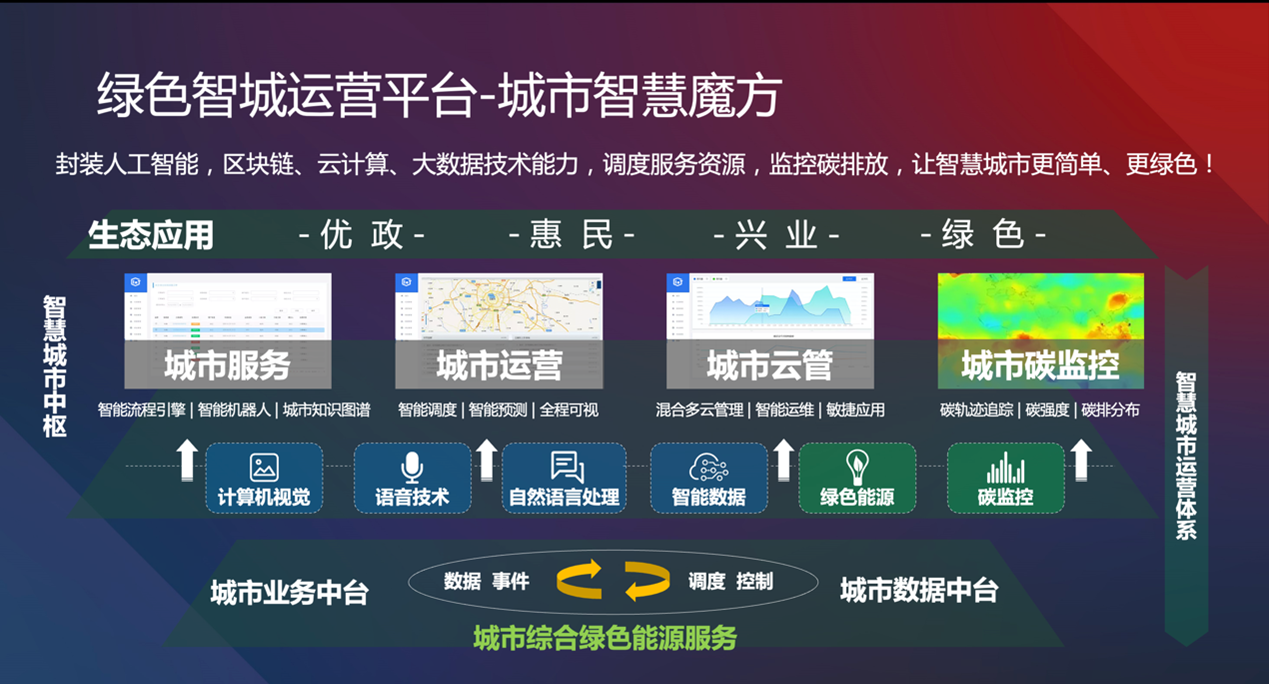 城市智慧魔方作为联想服务的核心平台,以业务中台和数据中台为基础,将整个智慧城市管理中心、运营中心打造成一个综合的城市绿色能源服务中心,成为城市碳中台,帮助城市的管理者统一的规划碳排放的配比,追踪碳轨迹,评估碳的强度,以及监控碳排放的程度,建设绿色智慧城市。