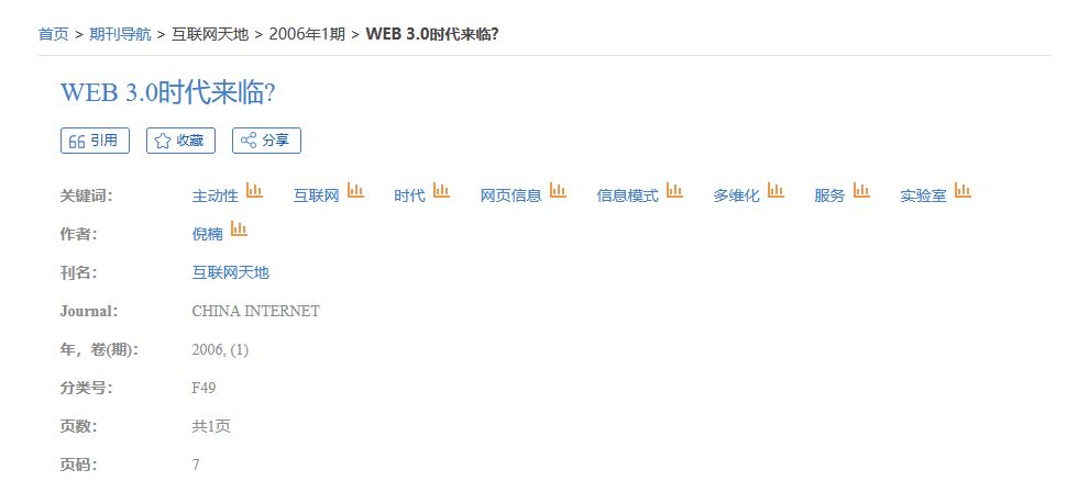 Web3.0只是由业内人士制造出来的概念词语,是基于Web1.0和Web2.0所定义的互联网发展的下一阶段。早在人们提到Web2.0的时候就认为还会有Web3.0。虽然他们也不知道Web3.0是什么,会在什么时候实现。万方数据显示,《互联网天地》期刊在2006年第1期中就刊登过《WEB 3.0时代来临?》的文章。