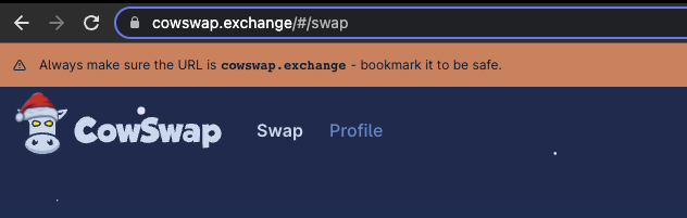 一个简单有效的例子是,在去中心化交易平台CowSwap上,它会通过用户警告的方式来确保用户处于正确的网站。