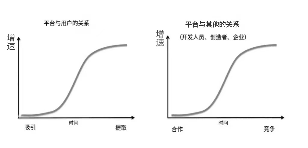 当他们到达S曲线的顶端时,他们与网络参与者的关系从正和变为零和。要想继续增长,则需要从用户那里提取数据,并与(以前的)合作伙伴竞争。