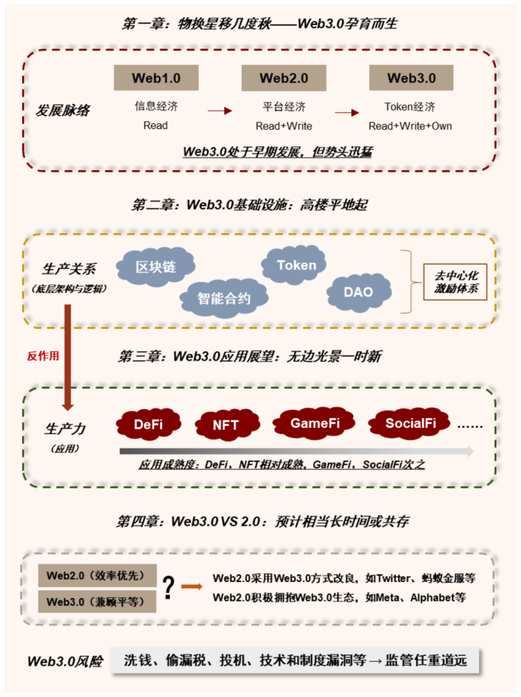 Organization(组织形式):Web3.0的组织形式以network代替2.0时代的平台。典型的组织形式为DAO——去中心化自治组织,将组织的管理和运营规则以智能合约的形式编码在区块链上,从而在没有集中控制或第三方干预的情况下自主运行的组织形式。DAO可以理解为一种高度自治的社区,其生产激励来源Token,组织内部的决策基于共识机制下组织内部成员的投票,而投票权则基于Token。