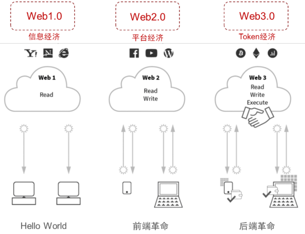 Interact(交互方式):Web1.0以“可读”(read)为主,Web2.0用户参与感更强,“可读+可写”(read+write),Web3.0则是“可读+可写+拥有”(read+write+own),以用户为中心,强调生态各个参与方拥有相应权利(通过Token体系)。为了在没有互联网平台账户的条件下可信地验证身份,Web3.0利用区块链分布式账本技术(严防篡改的可信计算范式),发证方、持证方和验证方之间可以端到端地传递信任。