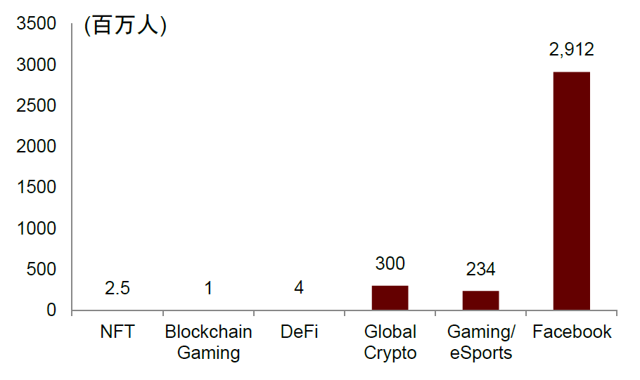Web3.0目前发展势头猛,但发展阶段早。Web3.0在2021年元宇宙概念获得关注之际获得了大量的融资,根据CB insights数据显示,2021年全球区块链初创企业融资金额达252亿美元,同比增长超700%。强大的资金流意味着强大的人才流,同时Web3.0的使用者在快速增长,因此Web3.0同时具备了供给端和需求端的增长动力。但相比于成熟2.0时代大厂,Web3.0不论从用户规模还是市值来看仍然较小,属于成长早期阶段:目前Web3.0中用户最多的是数字货币使用者,约3亿人,距离Facebook的MAU(29亿人)仍有较大差距;其次是DeFi、NFT,均在百万人次的量级。