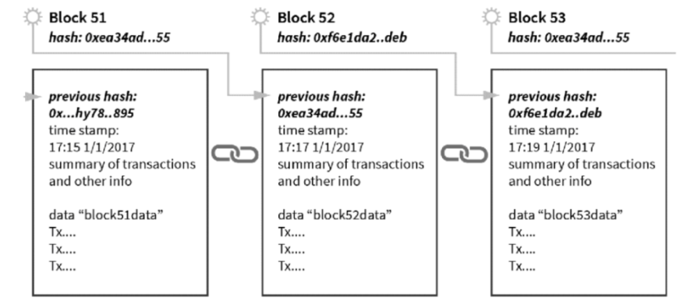 图表:区块链中区块的连接方式(每一个区块包含了前一个区块的Hash值)