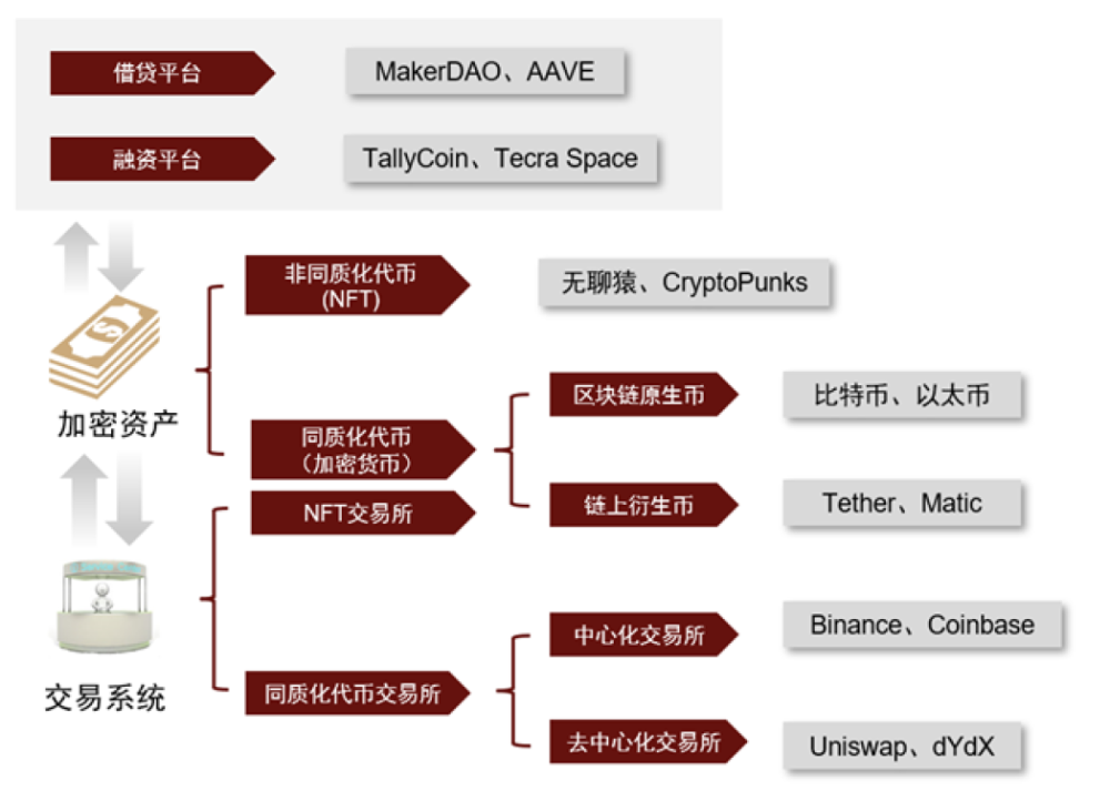 总的来说,DeFi体系的核心由加密资产和交易系统两部分组成,借贷、融资等其他类型平台则围绕这两个部分搭建。其中,加密资产可以分为非同质化货币和同质化货币两个类型——非同质化代币(Non-Fungible Tokens)即NFT,而同质化代币又包含类似比特币、以太币的区块链原生币,以及以ERC-20 Token为代表的链上衍生币。交易系统是用户进行加密资产交易的场所,根据是否由智能合约自动完成交易分为去中心化交易所和中心化交易所。实际上,目前交易所是Web3.0应用生态最大的“流量入口”,核心原因是各种加密资产交易需求是当下行业最广泛需求。虽然部分交易所也能实现借贷等功能,但一些实现特定功能的平台还是随着用户多样化的需求应运而生,例如借贷、融资等平台,也是DeFi体系不可或缺的一部分。