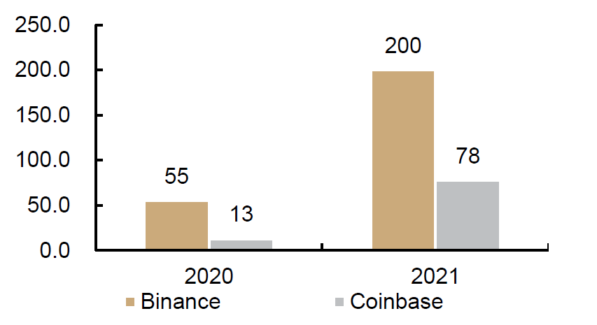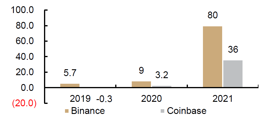 目前交易所以Binance交易量为首。Binance(代币为BNB)是华裔加拿大人赵长鹏于2017年建立在中国的一个中心化交易所,中国加强对加密资产的监管后迁往海外。2019年美国也禁止了Binance的运行,于是推出了专供美国使用的Binance US。截至2022年4月底,Binance仍是世界上交易量最大的加密资产交易所。Binance的用户数量、营收规模以及净利润都遥遥领先目前唯一上市的中心化交易所Coinbase。
