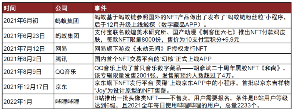NFT在我国被定义为数字藏品。数字藏品中的“藏”也意味着NFT在我国目前是不可以在二级市场进行交易的,以防止出现极端炒作的情况。最早开拓NFT领域的是支付宝,2021年6月支付宝发布了“蚂蚁链粉丝粒”小程序(后改为“鲸探”APP),并发行了限量版NFT版付款码皮肤,紧接着是腾讯于8月上线国内首个数字藏品交易平台幻核,随后京东、哔哩哔哩等也相继入场。目前从商业闭环来看,以区块链技术+文创IP结合是国内的核心方式。
