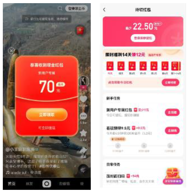 抖音、快手极速版:抖、快的极速版直接采用现金红包的形式——邀请新人下载、观看视频、做任务均可获得红包,目的在于为平台拉新、留存。与其花钱在其他平台做营销买用户,不如直接把相应激励返还给用户,不得不说这里面拥有更多Web3.0影子。