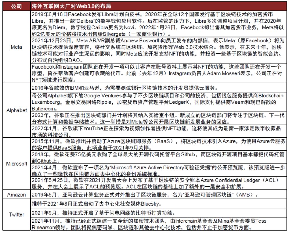 自我革命是追求可持续发展的必须。相对来看,海外互联网大厂对于Web3.0领域的动作更明显,布局也更迅速。Meta基于Oculus主推的元宇宙生态,表示了对Web3.0拥抱的态度。此外,Alphabet也设立了区块链部门,研究下一代分布式计算和数据存储技术。相对来说,由于国内监管态度相对谨慎,我国互联网大厂布局Web3.0更多围绕监管相对开放的区块链、数字藏品等展开。此外,在海外市场也对相关公司进行了投资布局。